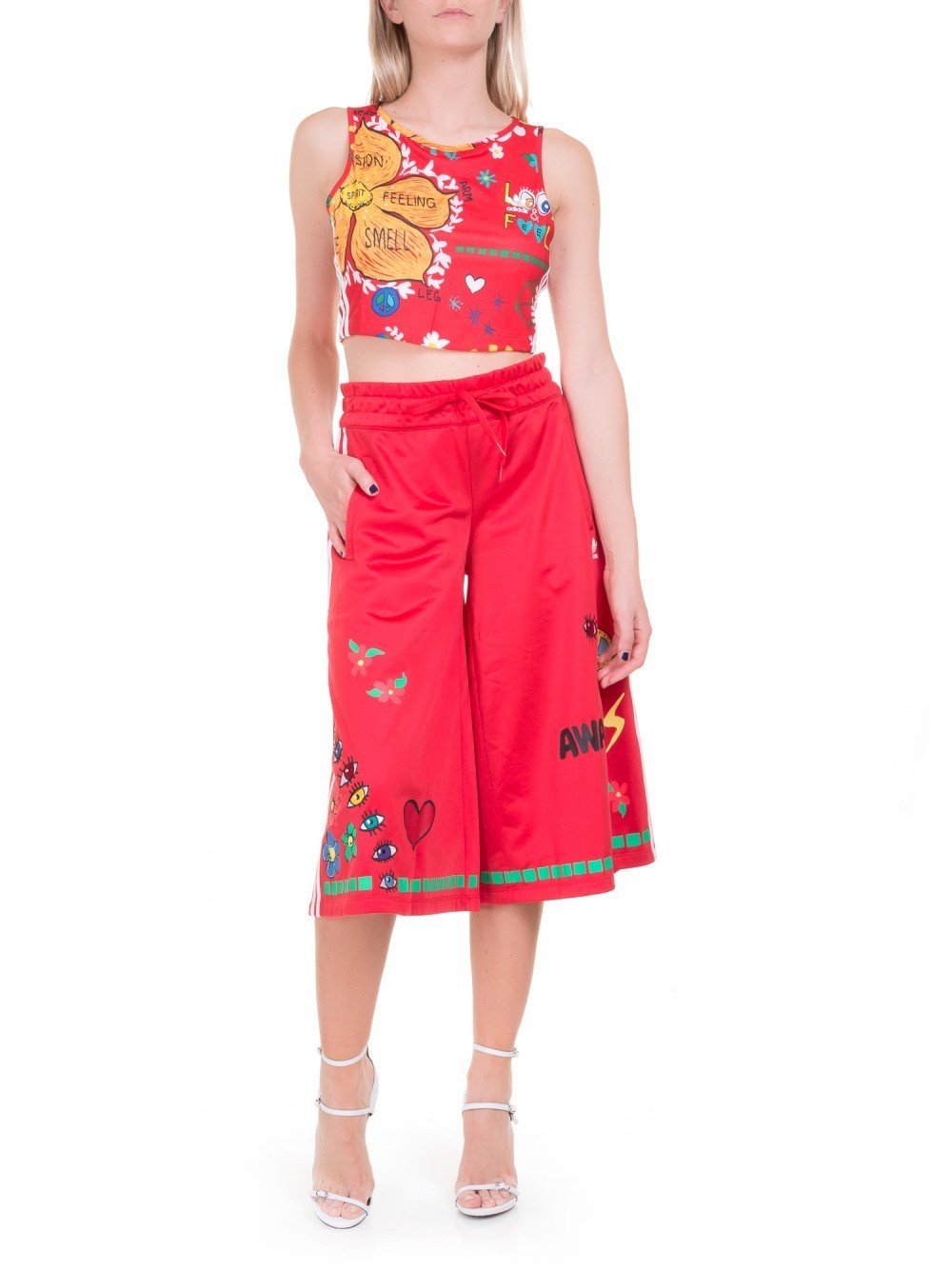 Кюлоты были частью спортивной одежды, поэтому смело можно надевать спортивную обувь. Следует избегать массивных кроссовок и ботинок, так как они утяжеляют фигуру. Кеды ярких цветов и рисунков дополнят задорный молодежный образ.