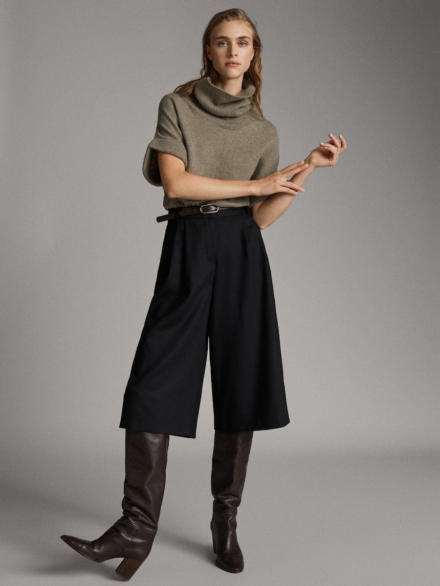 Хотя их с удовольствием носили летом, сочетать для холодной поры оказывается немного сложнее. Есть один нюанс, который нужно учитывать при подборе подходящий кюлот, это их длина. Они должны быть средней длинны или, для девушек маленького роста, выбирайте ниже колена. Обувь на каблуках – лучшая к такому фасону брюк.