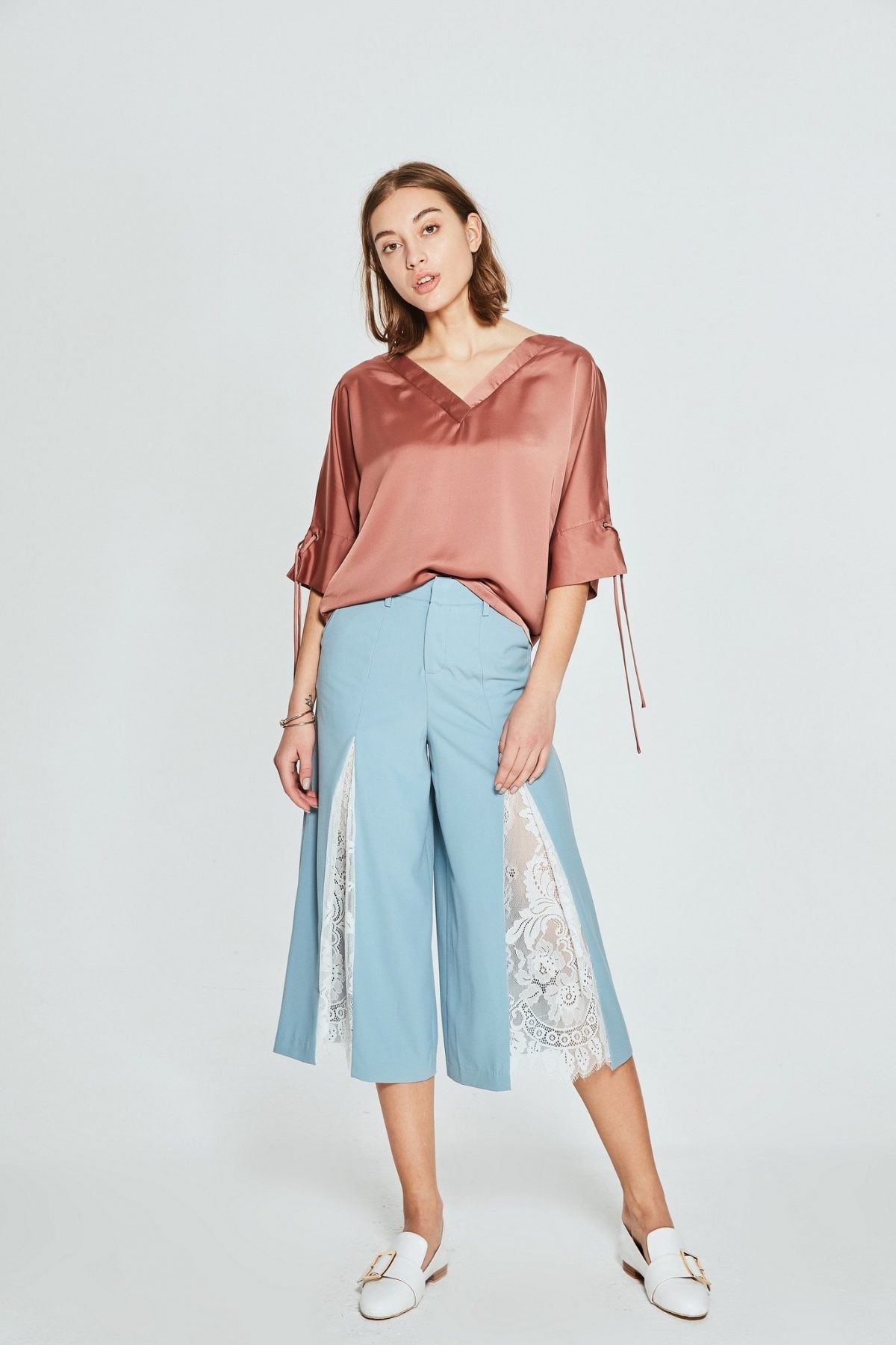 - Светлый кружевной кроп-топ. Кюлоты выглядят удачно с облегающим верхом. Это применение банальной хитрости – носить узкую кофту с широким низом, чтобы выглядеть высокой и стройной. Кружевной топ сочетается с обувью на каблуках, что позволяет добиться сдержанного сексуального и роскошного стиля.