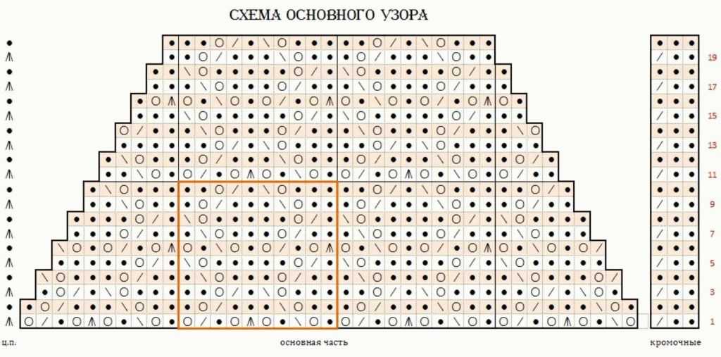 - Наберите на спицы 1 п, затем продолжайте вязать по схеме, делая при этом прибавление п. Когда у вас будет образовываться новый орнамент в начале полоски, наберите еще 3 п.