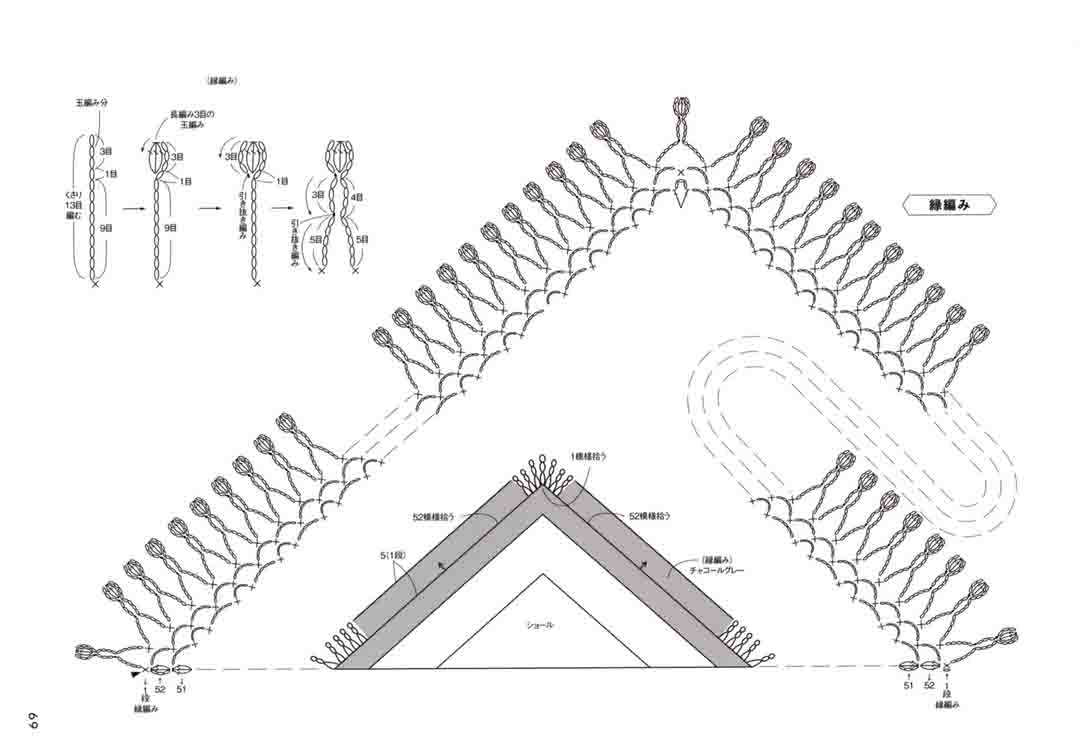 В этой схеме очень удобно и то, что число рядов и, соответственно, с ними длина может изменяться в течение всего вязания. Интересная схема показывает, что ряды — это стороны треугольника и вязание происходит с одним углом. Получается, что регулируется и длина, и ширина шали одновременно.