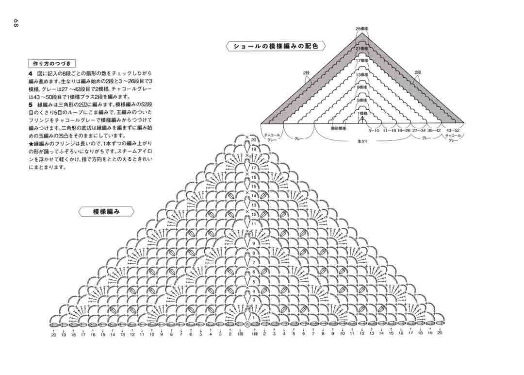Наша работа распределяется на три этапа: схемы представлены в соответствии с ними. Мы предлагаем пошаговую инструкцию к каждому ряду: для того, чтобы ваш результат совпадал с шалью на изображении выше, вам необходимо четко следовать всем указаниям к количеству и виду петель.