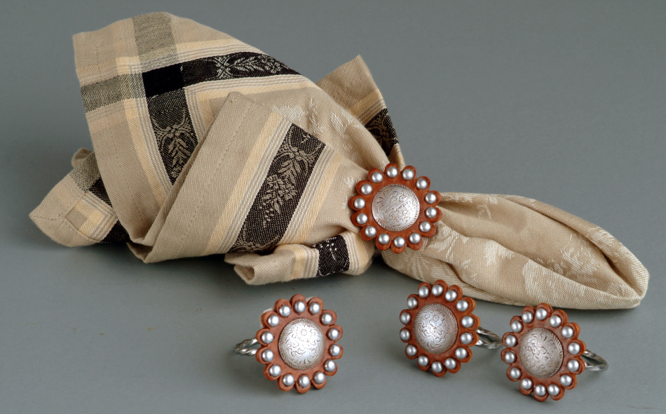 Справа текстильные или бумажные изделия размещают на большом столе, чтобы они не оказались впритык к бокалам. Салфетки кладут слева, если на столе не будет хлебной тарелки. Но изделия не должны быть расположены рядом с прибором гостя, который сидит с левой стороны. Их также можно положить на тарелку для хлеба, если он будет подан к столу позже. На тарелку для закусок ставят накрахмаленный предмет сервировки, сложенный в форме веера, лотоса или конуса. Также его можно положить слева, украсив сервировочным кольцом.