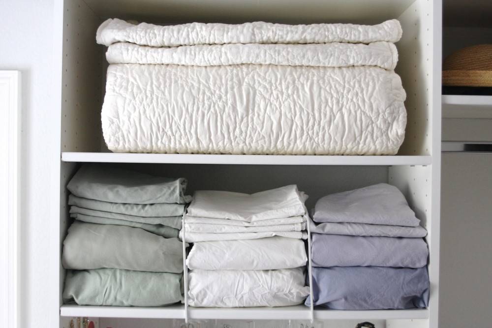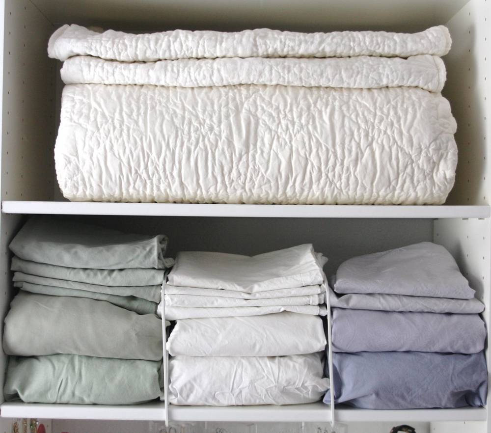 А вот разделить все детали можно лишь в том случае, если в шкафу достаточно места выделить для каждой детали отдельную полку. Например, для наволочек — одну, для пододеяльников — другую.