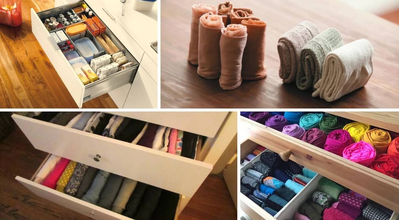 Затем все элементы нужно разложить по коробкам или специальным контейнерам для хранения. Но здесь есть один нюанс — только вертикальное расположение. Да, Мари Кондо — автор этой методики — поклонник вертикального хранения.