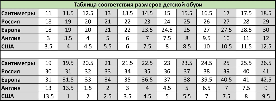 Измеренную длину стопы находим в таблице и в соответствующей строке определяем нужный нам размер.