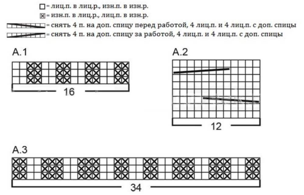 *1 изнаночную перекидываем на дополнительную спицу за работой, 2 лицевые, 1 изнаночная с дополнительной спицы, 2 лицевые перекидываем на дополнительную спицу перед работой, 1 изнаночная, 2 лицевые, 2 изнаночные*.
