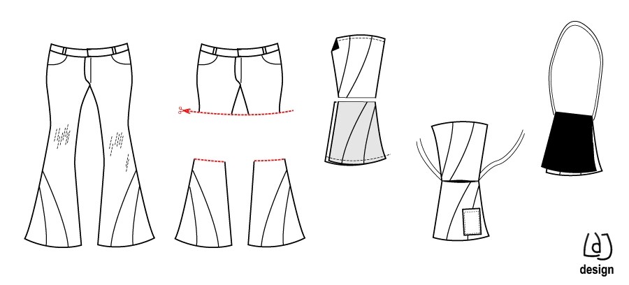В джинсах с широкими штанинами, джинсах клеш, можно использовать не только верхнюю часть, но и штанины, для создания необыкновенной сумки – мессенджер.