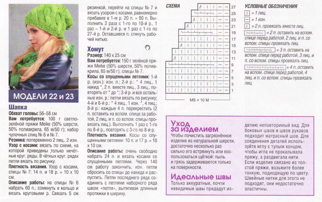 Небольшая схемка, на которой показано, как связать красивый зеленый комплект, шапку и хомут, с косами. Мастерицы, берите на заметку!