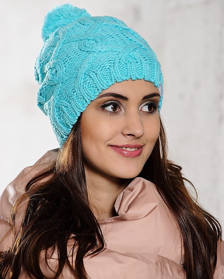 - с простым узором из толстых ниток и с меховыми помпонами на макушке.