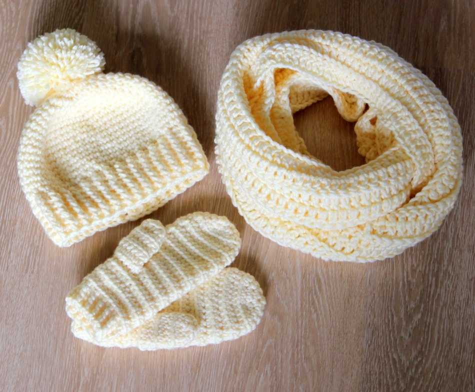 Еще один вариант стильного комплекта. Шапки связана столбиками без накида, снуд — столбиками с накидом.
