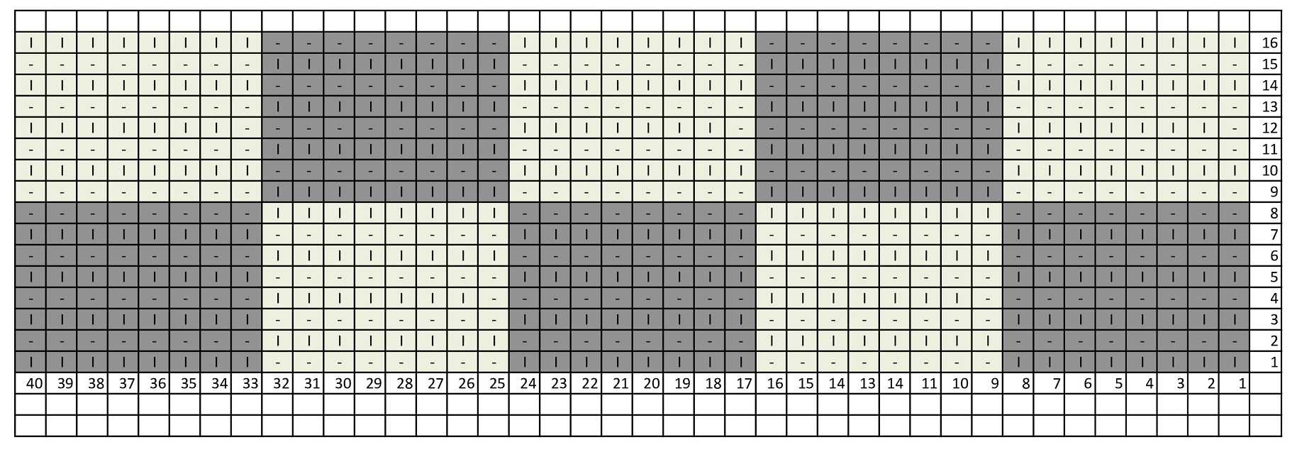 В шахматном порядке чередуются квадраты из 10 петель: узор резинка 1х1 и узор из лицевых и изнаночных полос. Узор хорошо смотрится в исполнении светло-серой пряжей и подойдет для вязания мужских шарфов.