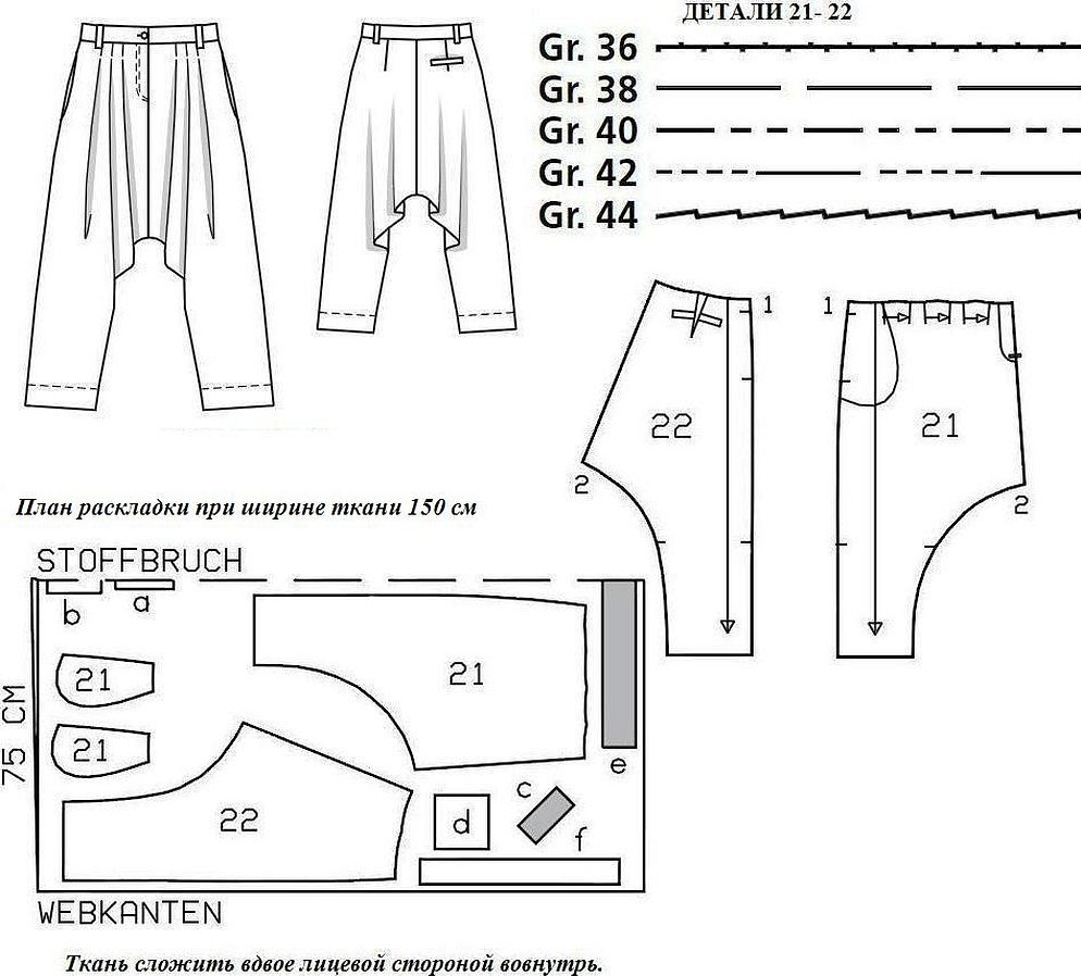 Излишнюю ткань можно застрочить или заложить в складки. Для таких фасонов подходит мягкий материал. Ширина нижней части штанов зависит от желаемой модели брюк.