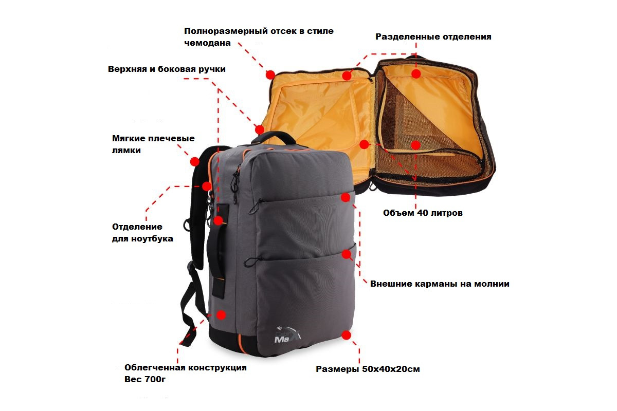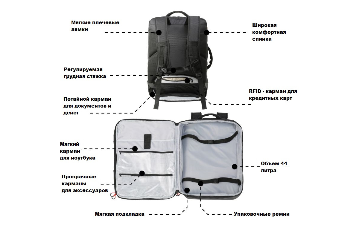 Рюкзак, подходящий под установленные большинством авиакомпаний габариты, как правило, имеет объем в пределах 35–40 л. Он сравнительно легкий, весит максимум 1,5–2 кг. Такие модели позволяют довольно свободно разместить внутри ноутбук, планшет, смартфон, иные нужные гаджеты, смену одежды, туалетные принадлежности.