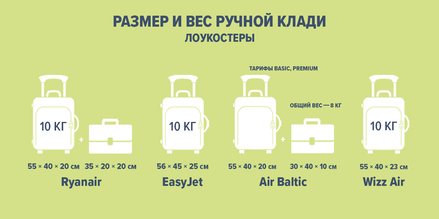 Что касается габаритов, большинство авиакомпаний, осуществляющих перелеты по всему миру, придерживается общепринятого стандарта – 55 х 40 х 25 см. Исключением является, например, Emirates (55 х 38 х 20 см). Из российских перевозчиков стандартами руководствуются «Аэрофлот», его дочерние компании, S7. У Utair параметры уменьшаются до 40 х 25 х 20 см. Но наиболее строго к габаритам и массе ручной клади по традиции относится любой лоукостер. У российской «Победы» допустимые ее размеры – всего 36 х 30 х 4 см.