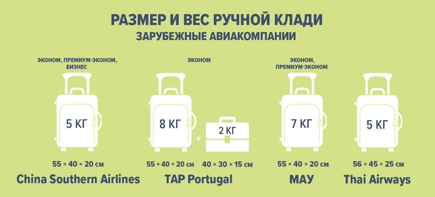 Тревелхак: несмотря на то, что каждая авиакомпания устанавливает свои индивидуальные требования к размерам и весу ручной клади. Вы можете купить сумку или чемодан, которые соответствуют нормам провоза большинства авиакомпаний. Максимальные размеры ручной клади (включая ручки и колеса) должны быть не более 55 x 40 x 25 см на внутренних рейсах по России, и 56 х 36 х 23 см на бортах зарубежных авиалиний.
