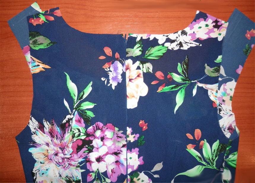 Оформляем срезы пройм и горла обтачками. Приутюживаем так, чтобы на изнанке получился кантик.