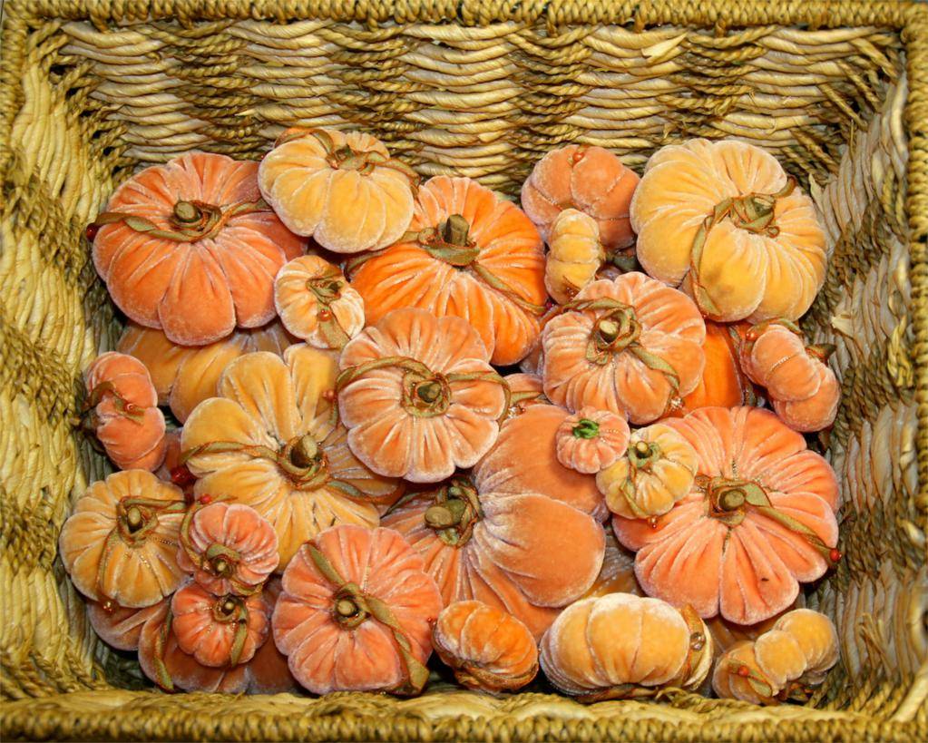 Изготовить такую красоту из ткани очень просто, работа не требует специальных навыков. Некоторые мастера рукодельного искусства могут и вовсе обходится без процесса шитья, о чем мы расскажем ниже. Если нужно изготовить маленькую тыквочку-игольницу, то достаточно подходящей ткани, иголки и ниток в тон. Если масштабы творения значительнее, например, тыква в натуральную величину, то расход ткани будет больше, шпагат заменит обычные нитки, а тактика шитья – совершенно другая. Тыквы, выполненные в самых простых техниках, ничуть не уступают по внешнему виду тем, которые шьются из шести клиньев. Главное – заключительный декор и маленькие детали, которые придают настроение общей картине.