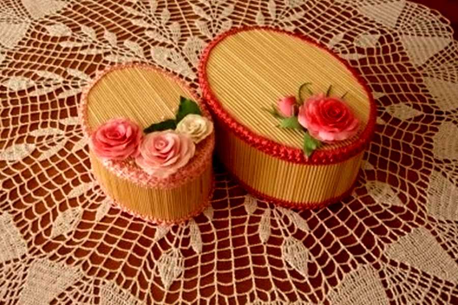 Идеи декорации шкатулок навеяны «Розовым настроением», тоже розы и бархатная бумага, но здесь основой послужили продуктовые контейнеры. Тот, что побольше, оклеен шпажками в 3,5 мм диаметром, который поменьше, 2 мм.