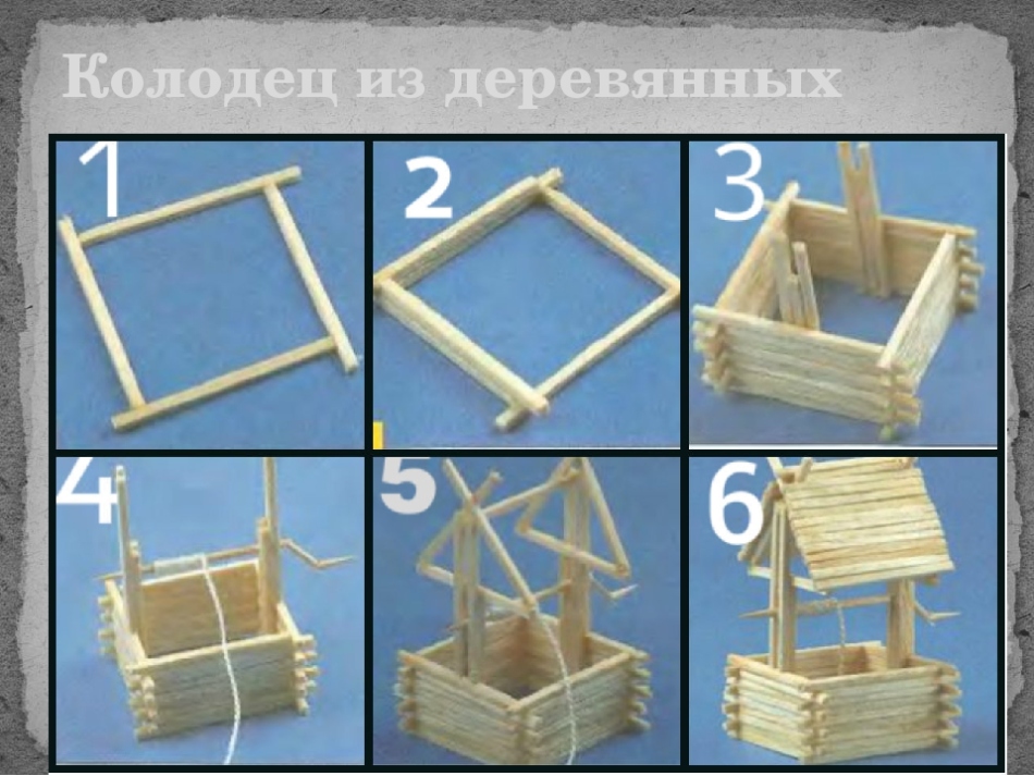 Если вы хотите порадовать своего ребенка, тогда предложите ему сделать колодец из зубочисток. Для изготовления такой игрушки вам понадобится клей, кусочек веревки ну и, конечно же, сами зубочистки.