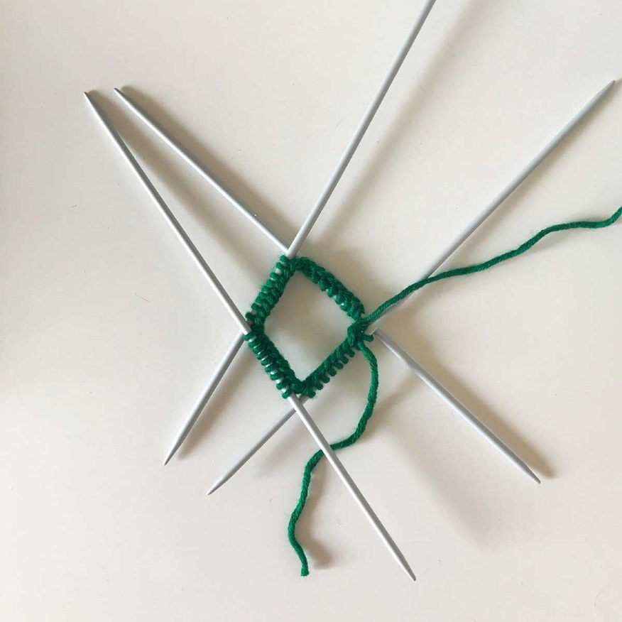 Далее на поверхности раскладывают спицы квадратом, хвостик нити остается с левой стороны, наборный ряд находится внутри. Теперь нужно замкнуть петли в круг. Вариантов, как это сделать, много.