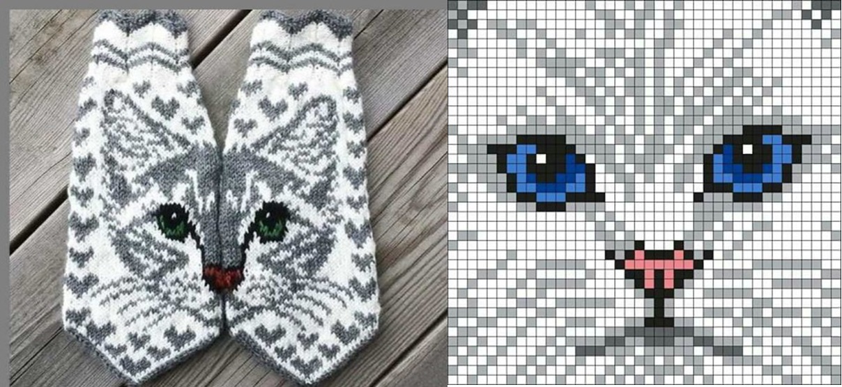 Дети любят животных и мультики — это не секрет. Так что мы советуем вязать для ребёнка яркие, разноцветные варежки. Присмотритесь к этой схеме узора с котом — такие ажурные варежки понравятся и мальчикам, и девочкам!