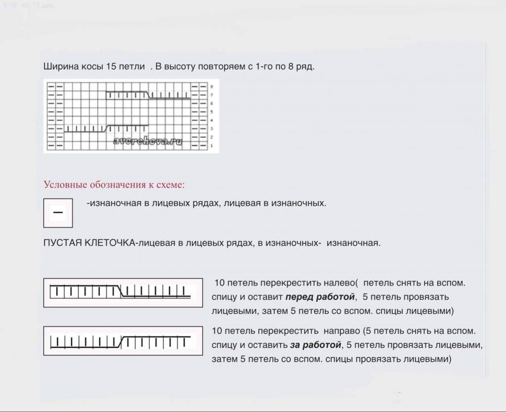 1 ряд – вяжем вместе лицевой две первые петли косы, 3 лиц. п., 5 п. на дополнительную спицу за работой, две вместе лицевой, 3 лиц. п., две петли вместе лицевой с доп. спицы, 3 лиц. п. с доп. спицы.