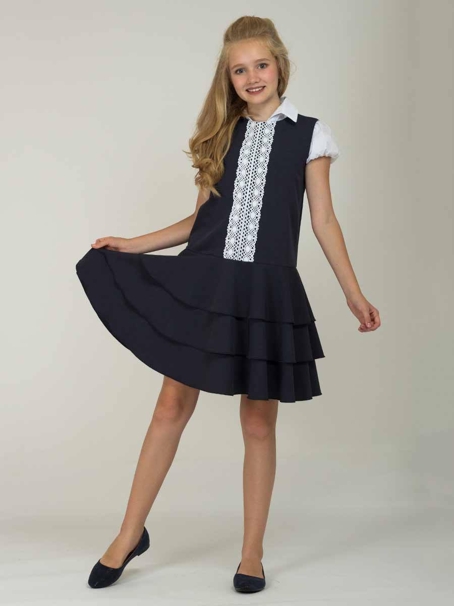 Как и в случае с ученицами начальной школы, на подростках великолепно выглядят сарафаны в синем, бордовом, коричневом исполнении. Темные тона добавляют образу стройности и лаконичности, а декор с кружевными вставками, воздушными жабо или бантами-балстуками добавляют ему нотки женственности и нежности.