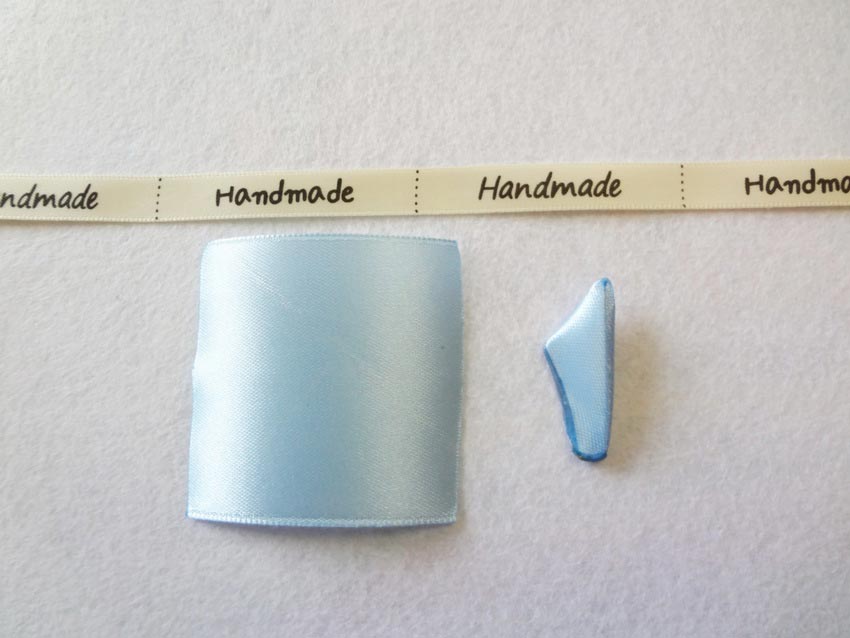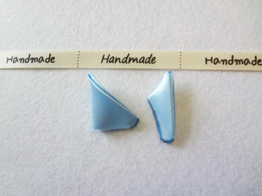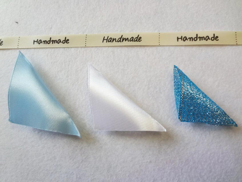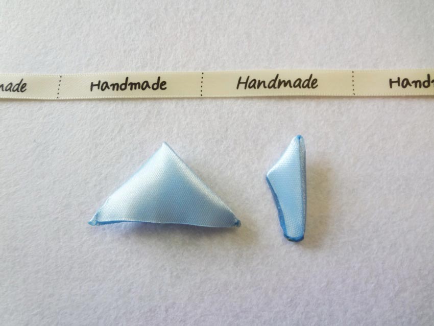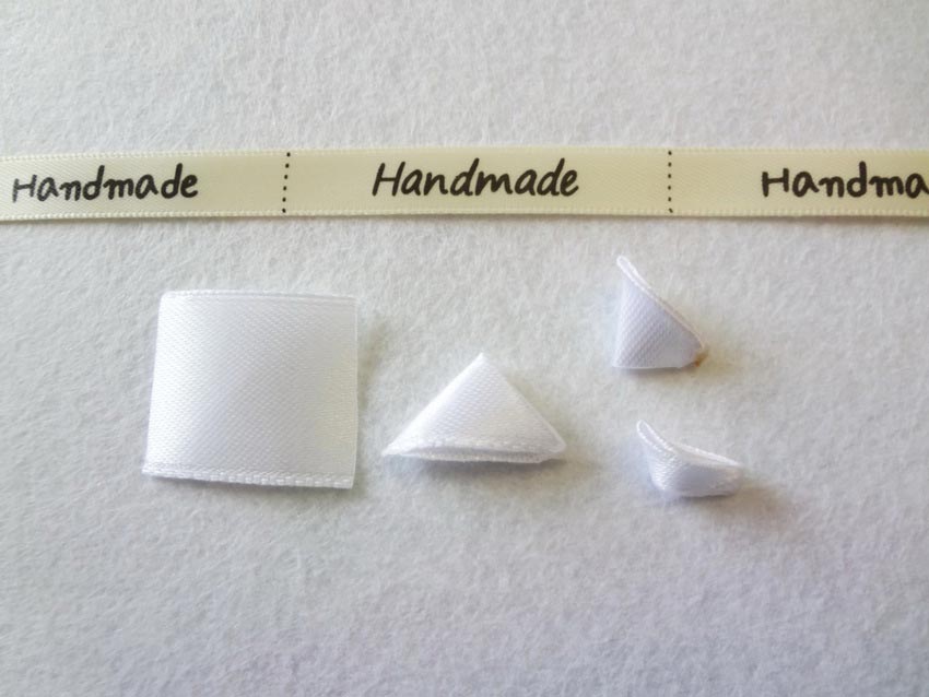 Квадратик из белой атласной ленты складываем по диагонали и спаиваем уголок зажигалкой или над огнем свечи.