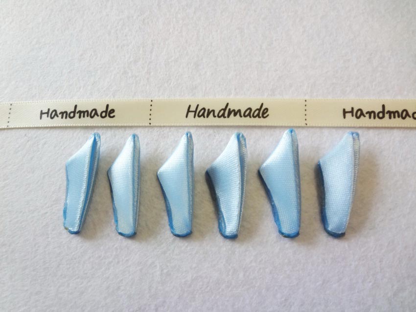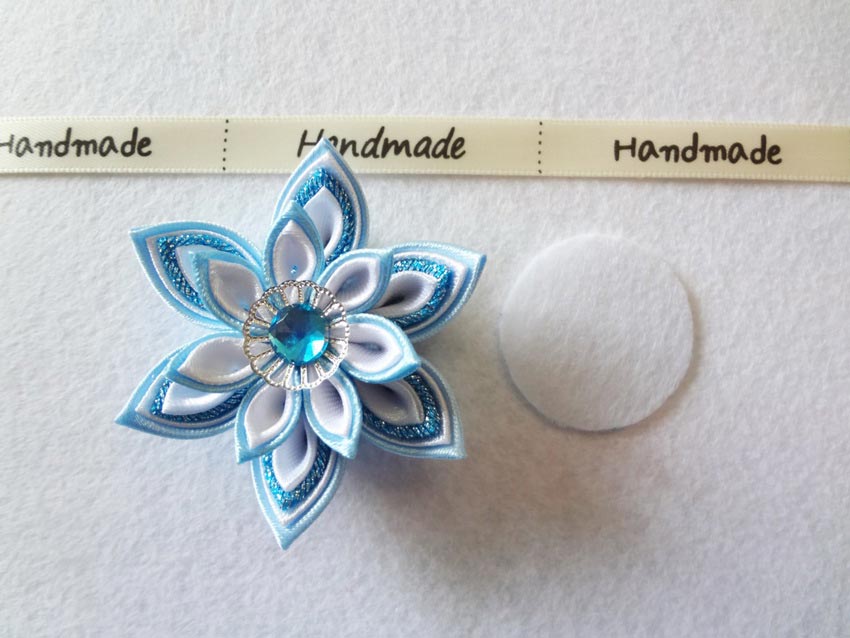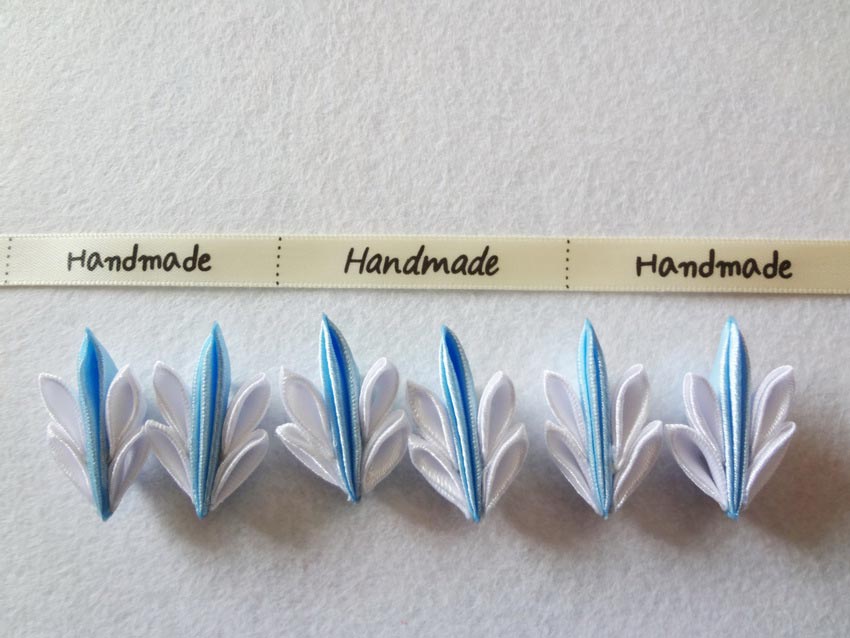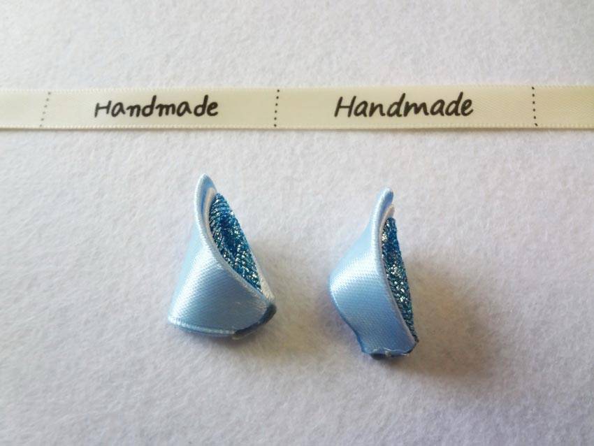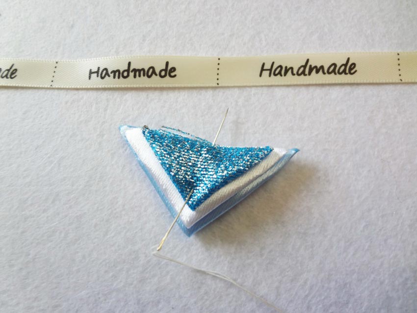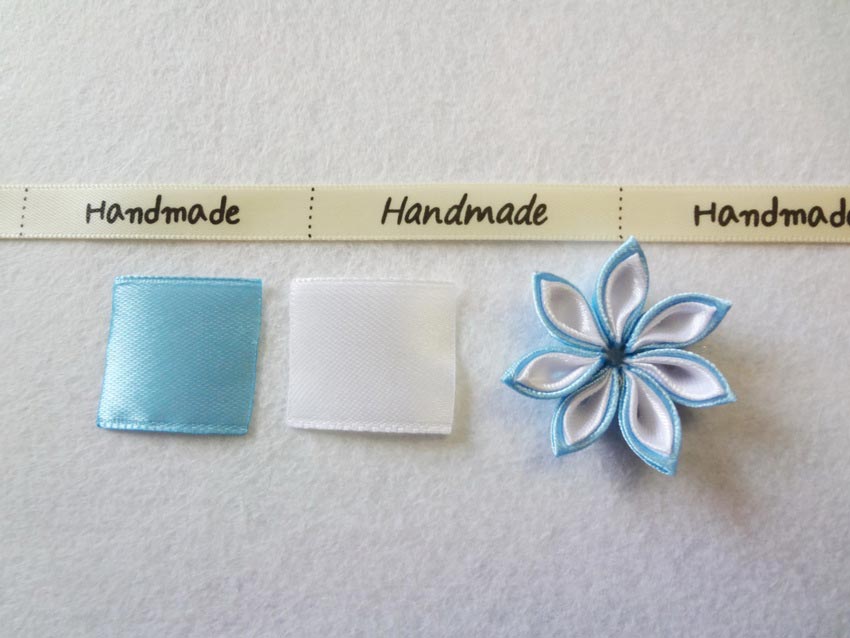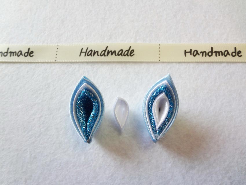 7. Нарежьте нежно-голубую и белую атласную ленту 2,5 см на 7 квадратов каждую. Сделайте двойные острые лепестки так, чтобы белая деталь оказалась внутри голубой. Соберите цветок, воспользовавшись нитью и иглой.