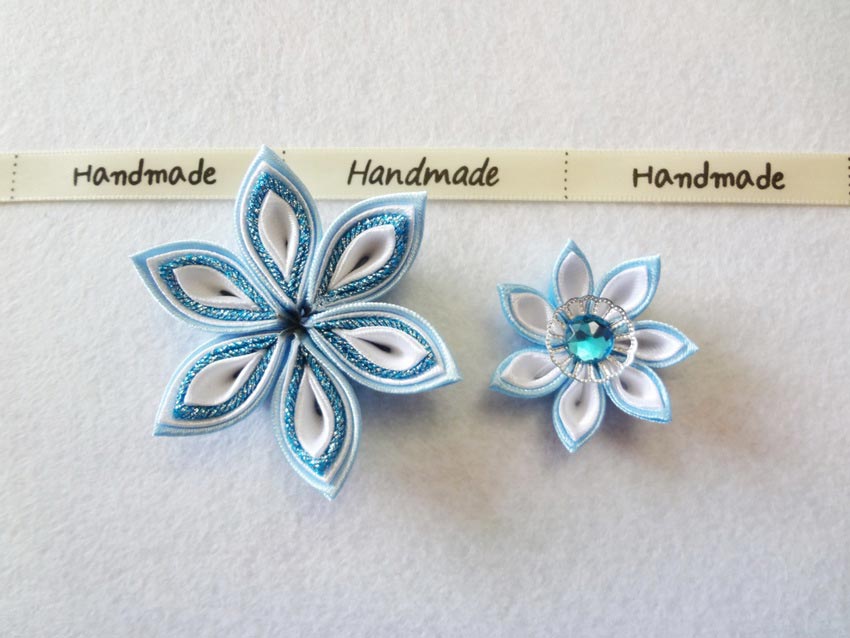 Используя удивительную технику канзаши, можно создавать не только цветы, но и снежинки, которые будут столь же красивы, но еще и сказочны. Такие новогодние изделия можно выполнить в белых тонах, дополнительно использовать сверкающие элементы парчи, стразы, полубусинки и прочие украшения. Кроме того, для создания новогодней атрибутики подойдет голубая, синяя или золотистая цветовая гамма.