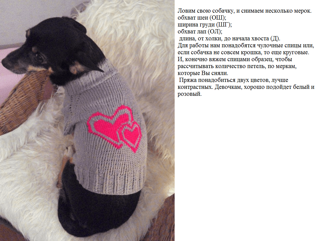 После того, как вы выполните узор, вяжите дальше по кругу. Длина вашего свитера зависит от мерок собаки, но не забудьте, что спинка всегда длиннее передней части. Когда вы все решите с длиной, начинайте вязать резинку два на два. Так вяжем примерно семь рядов и закрываем петли на животе, спинку оставляем.