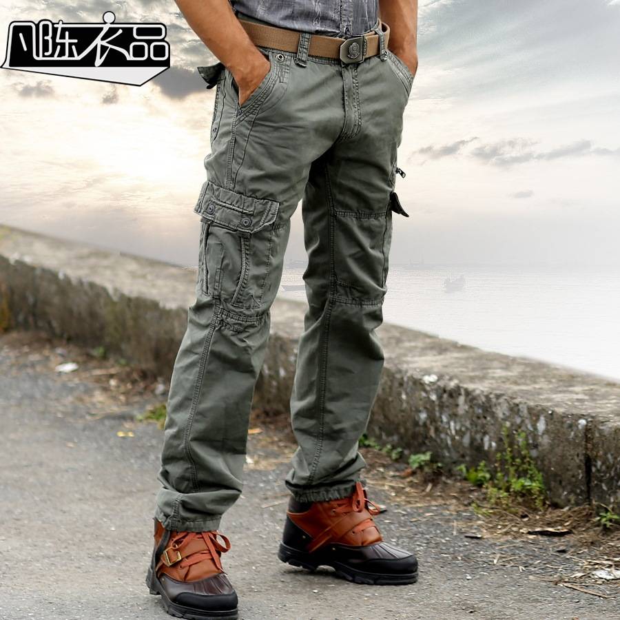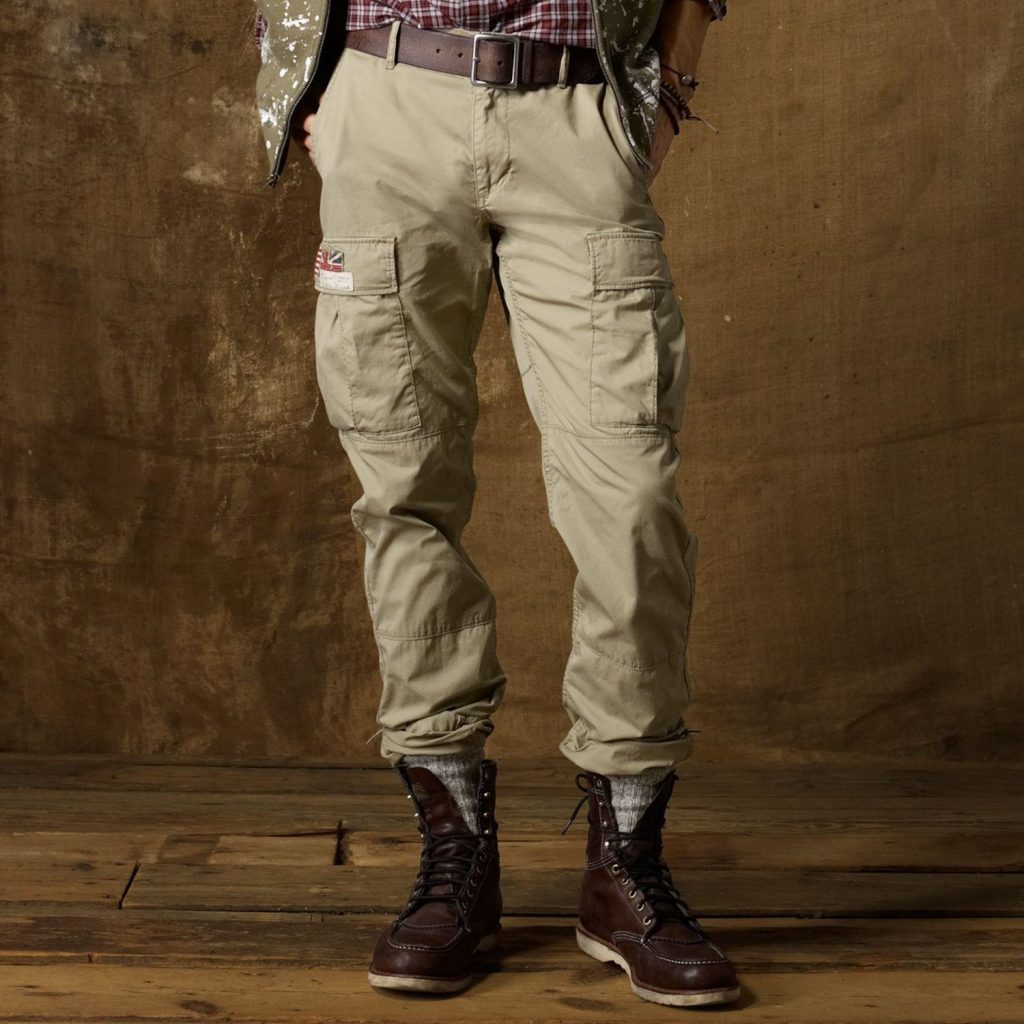 - Брюки карго. Свободные в бёдрах, зауженные книзу, возможно, с небольшими подворотами. По бокам – крупного размера накладные карманы. Обязателен кожаный ремень с бляхой. Для ярких образов приобретите брюки с камуфляжным принтом, для повседневных ненавязчивых хорошо подойдёт однотонный хаки, оливковый, грязно-коричневый.