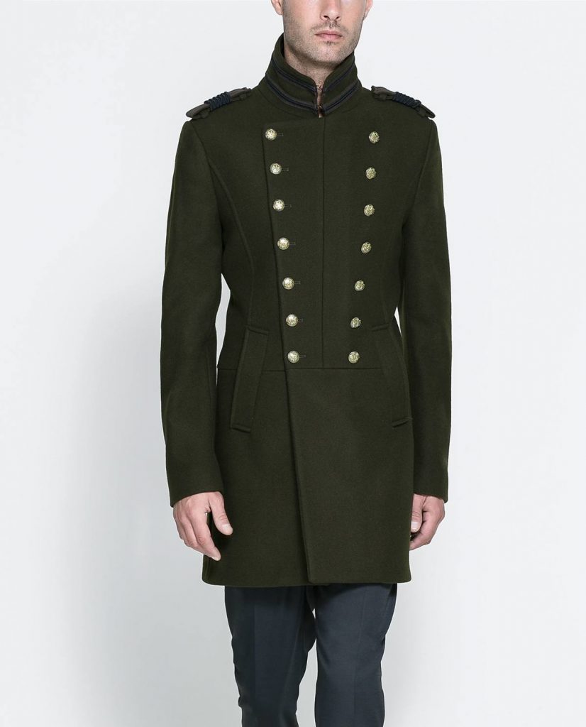 - Пальто. Отлично впишется в кэжуал кашемировое или драповое двубортное длиной до середины бедра (бушлат, шинель). Приветствуются военизированные детали – погоны, металлические пуговицы, например. Карманов на груди может не быть. Фасон желателен чуть приталенный, в рамках стиля. Цвет – от хаки до чёрного, конечно же, не камуфляж.