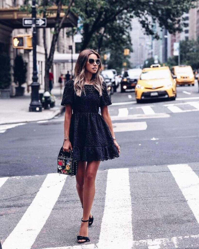 Для похода на прогулку можно выбрать короткое платье и объединить его с ботильонами или сапогами на каблуке.