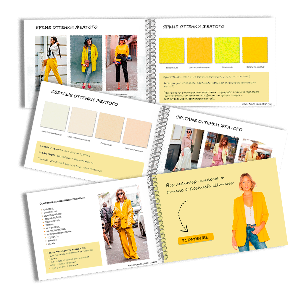 Желтая пастель: к этой группе относятся тона бледно-желтые, ванильные, шампань – это бледные оттенки, часто затуманенные. Они могут использоваться как в создании детски-нежных комплектов, так и в строгих, женственных вариантах. В паре же с ярким цветом служат приглушающим элементом.