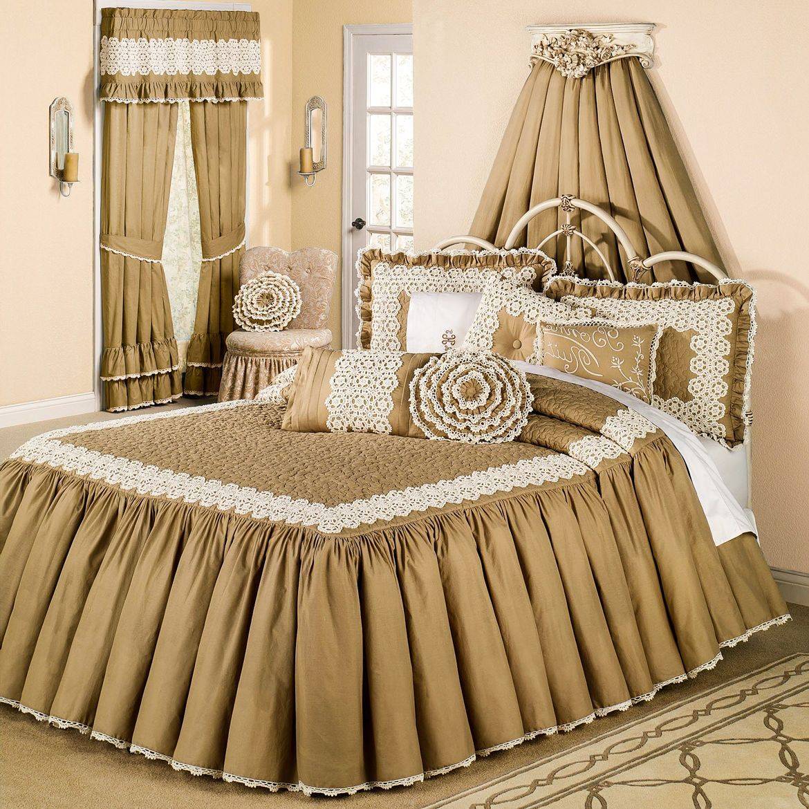 - Для королевской спальни скорее подойдет покрывало с тяжелой фактурой, богатой драпировкой и золотыми оттенками.