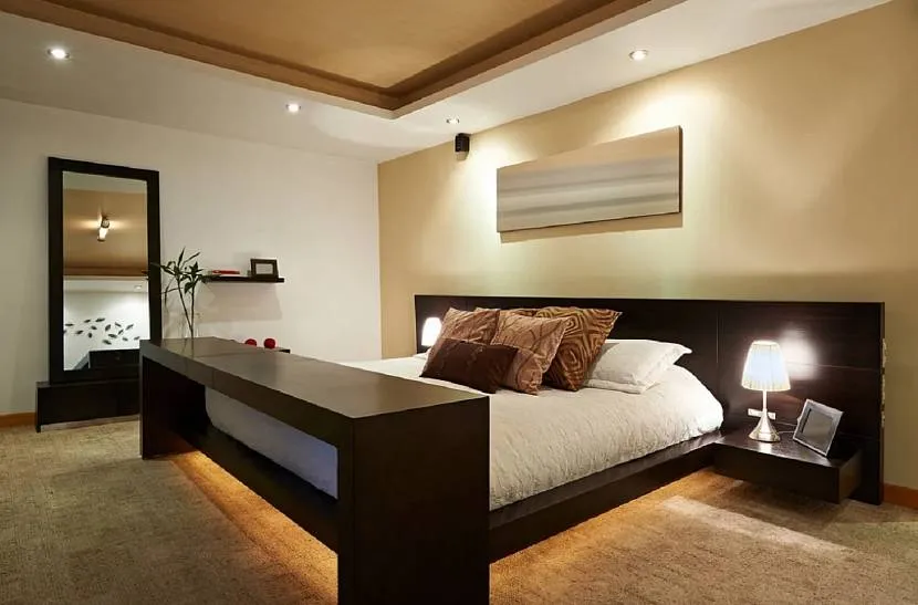 Чтобы коричневая комната не выглядела мрачной, нужно многоуровневое освещение (сценарии). Осветительные приборы организовывают для каждой зоны, не забывая об основном потолочном светильнике. Поворотные споты позволяют концентрировать электричество в определенных участках. Шкафы, полки и ниши подсвечивают диодной лентой.