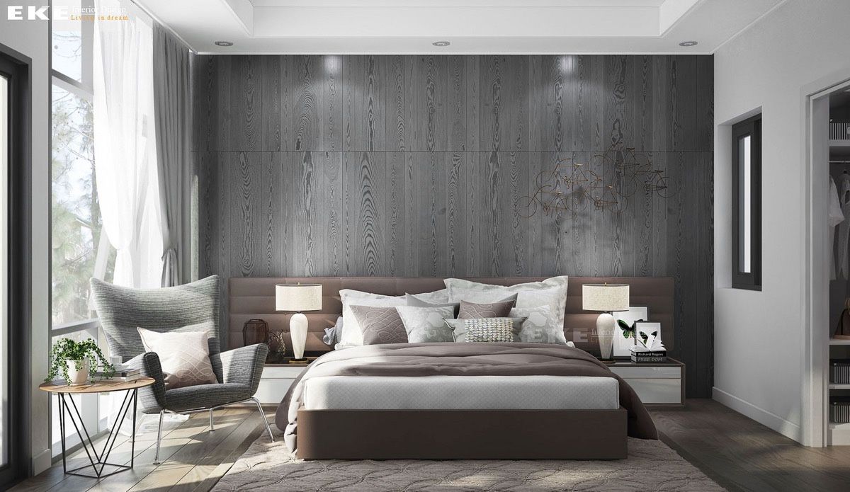 На основании выбранного стиля интерьера стены в серой спальне могут быть оформлены штукатуркой, деревом, камнем, кирпичной кладкой, обоями или декоративными панелями.