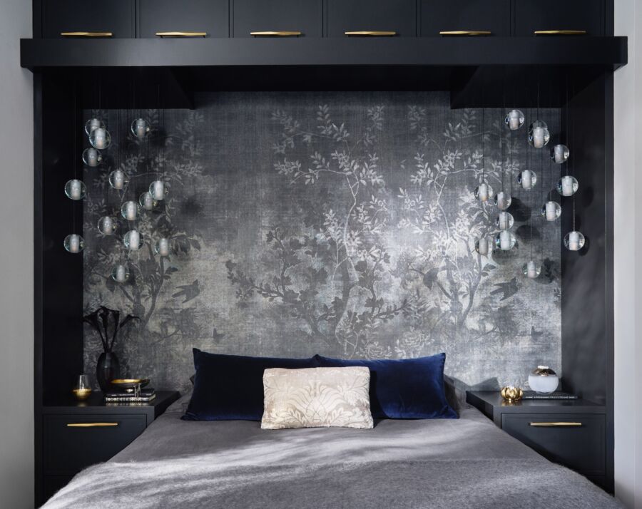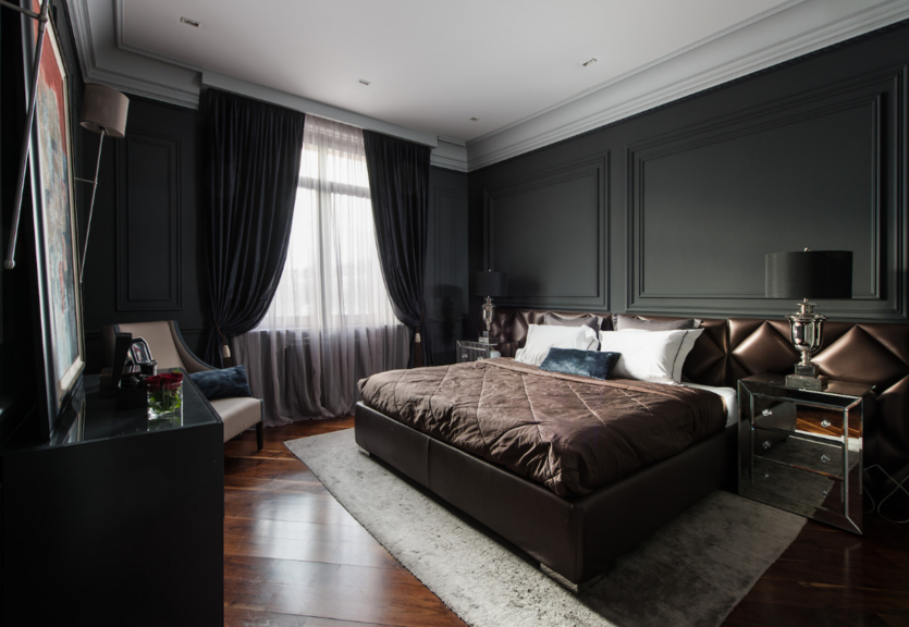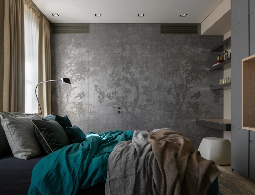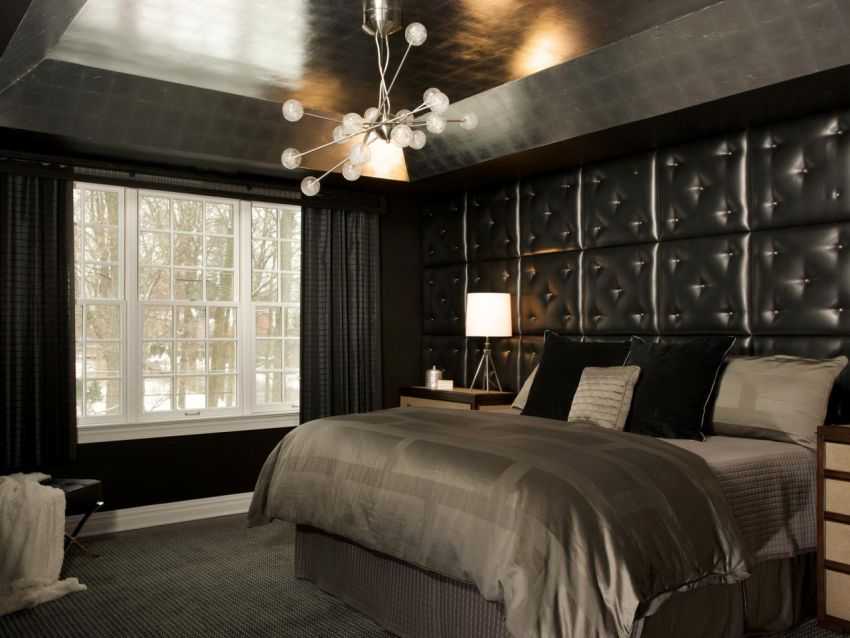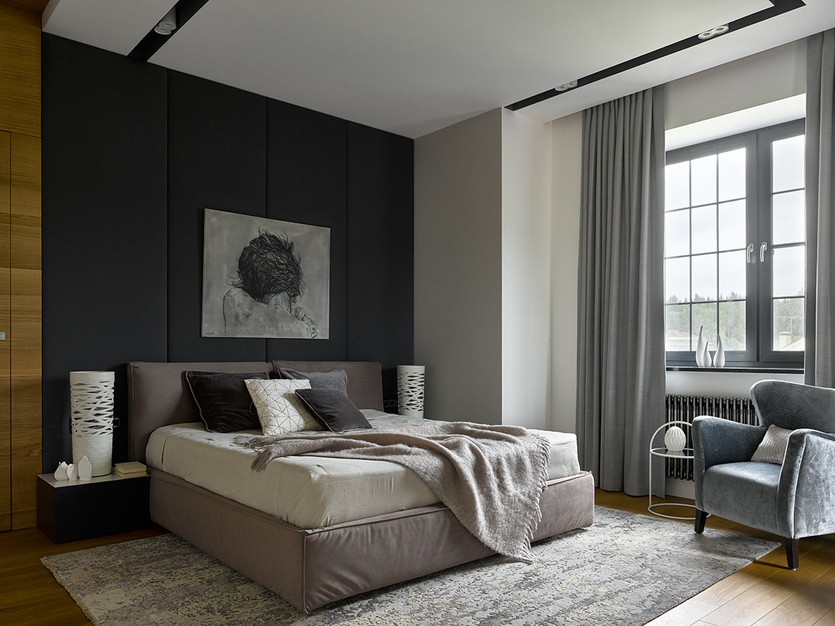 В комнате, предназначенной для сна, не нужно гнаться за активной легкостью пространства — немного полумрака будет еще уместнее, особенно если кому-то в семье нужно вздремнуть час или два в течение дня. А оттенки графита, туши, угля сейчас на пике популярности.