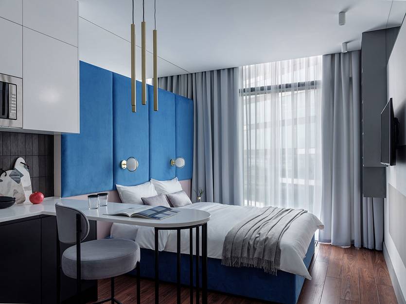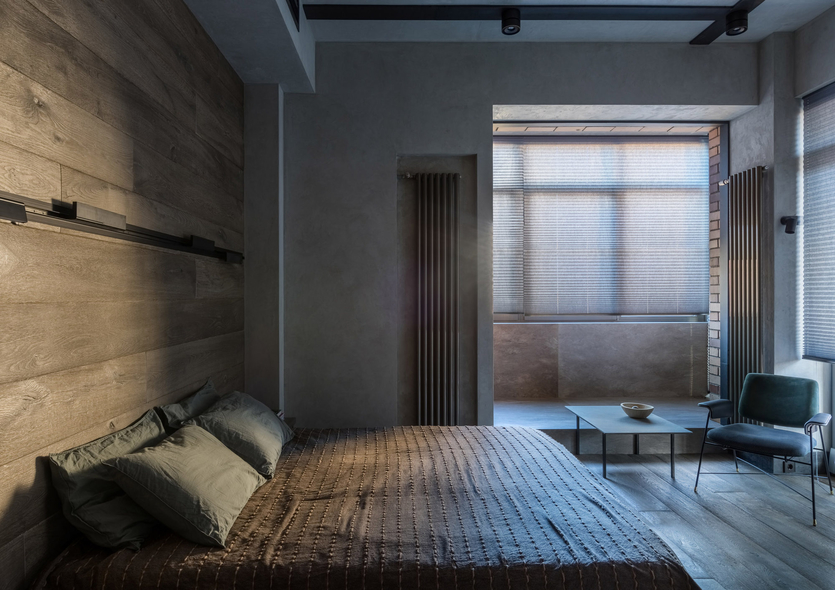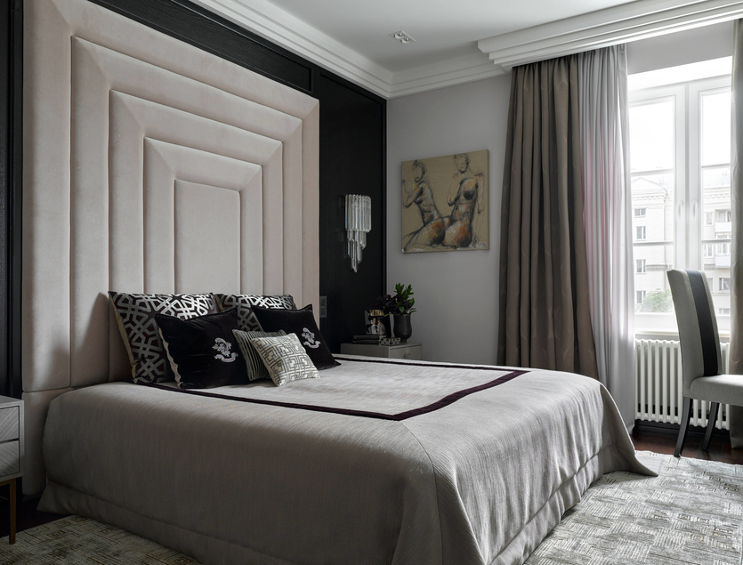 Убьем двух зайцев: высокая мягкая панель поможет немного изолировать комнату и нейтрализовать визуальную строгость палитры.