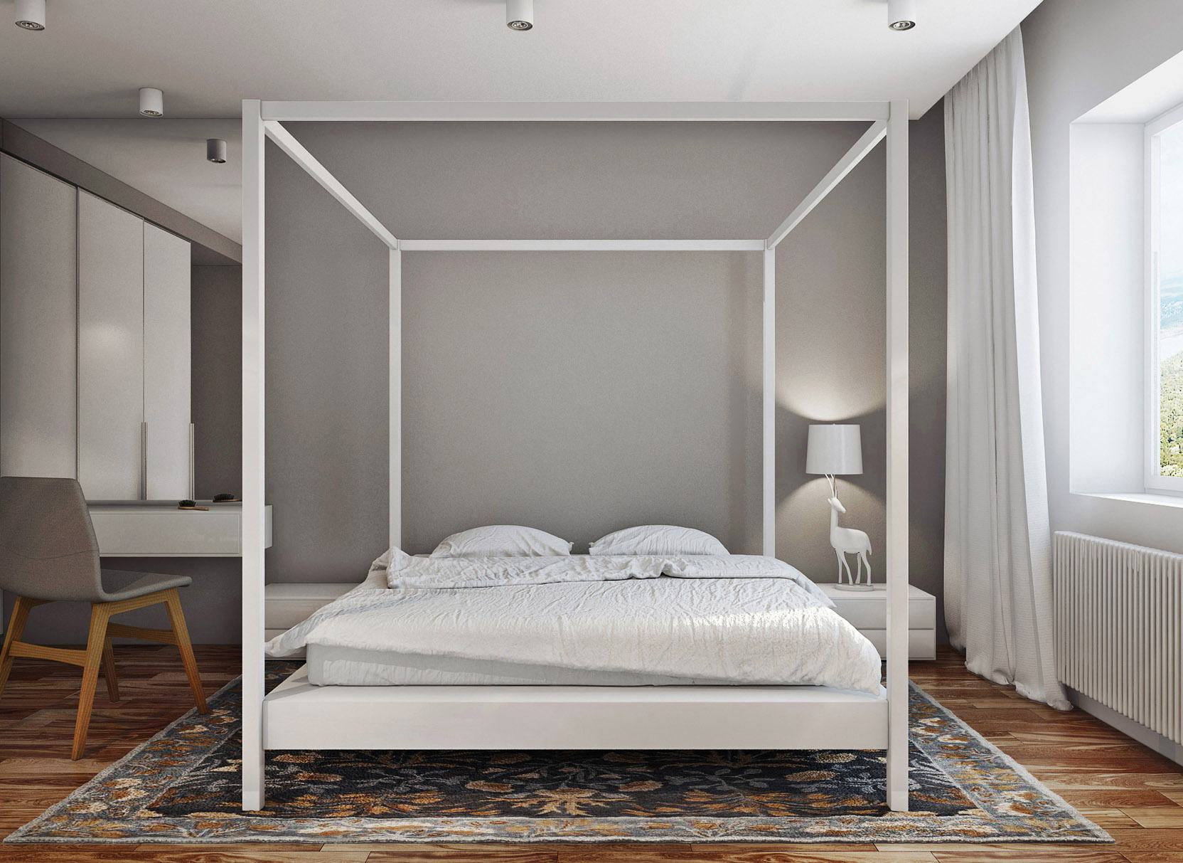 Для южной спальни, оформленной в стиле минимализма, необходимо использовать приглушённые серебристые оттенки. Они сделают комнату светлее и объёмнее.