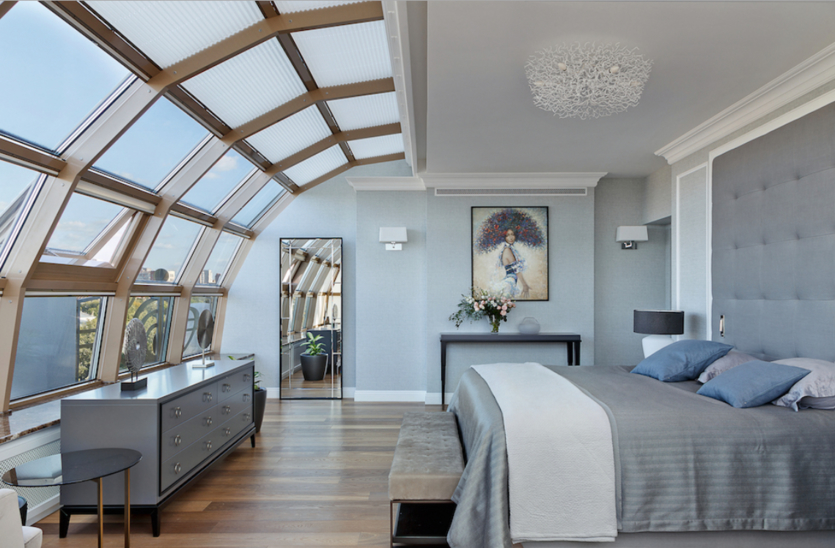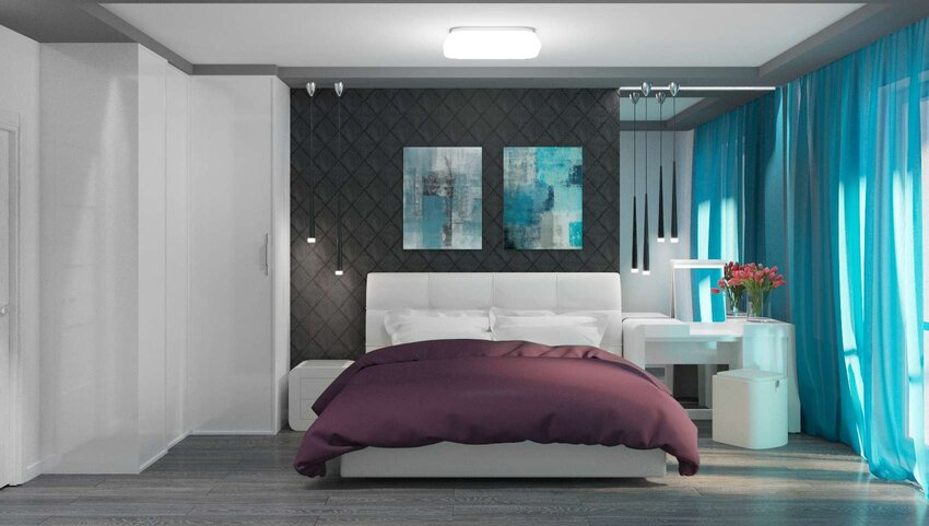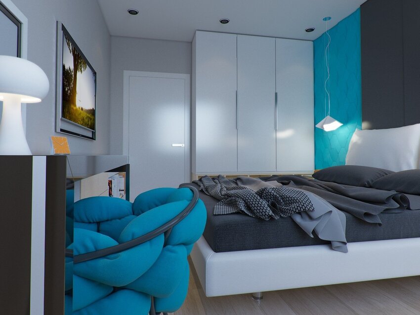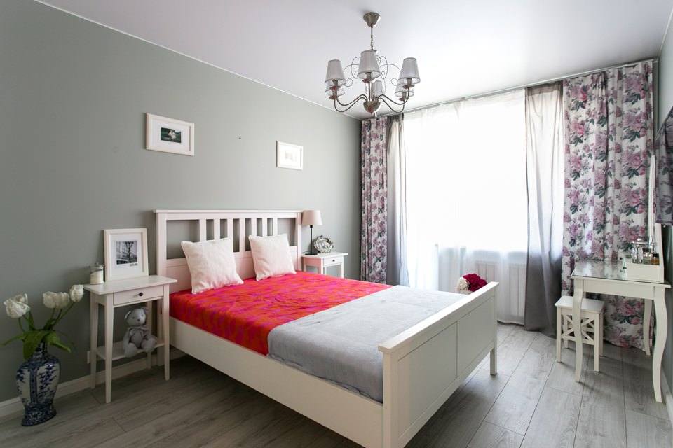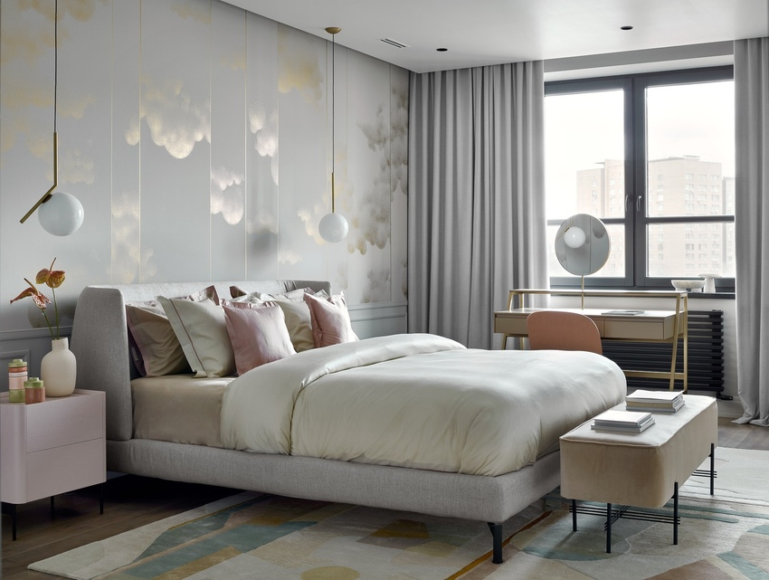А если оформить спальню в серо-голубых или, скажем, серо-сиреневых тонах, то яркая палитра поспособствует легкому пробуждению утром.
