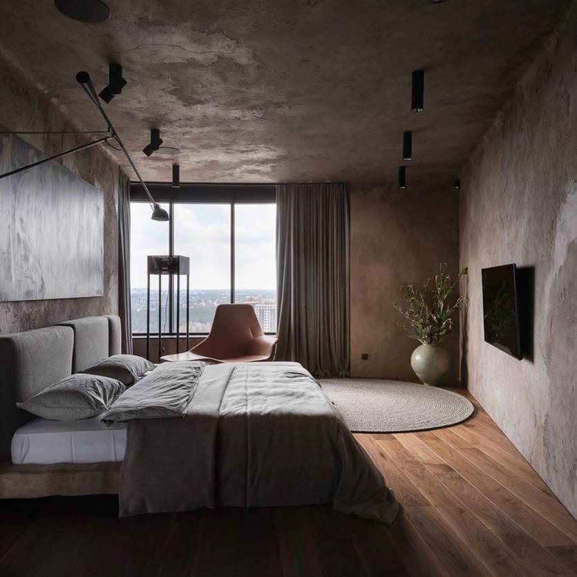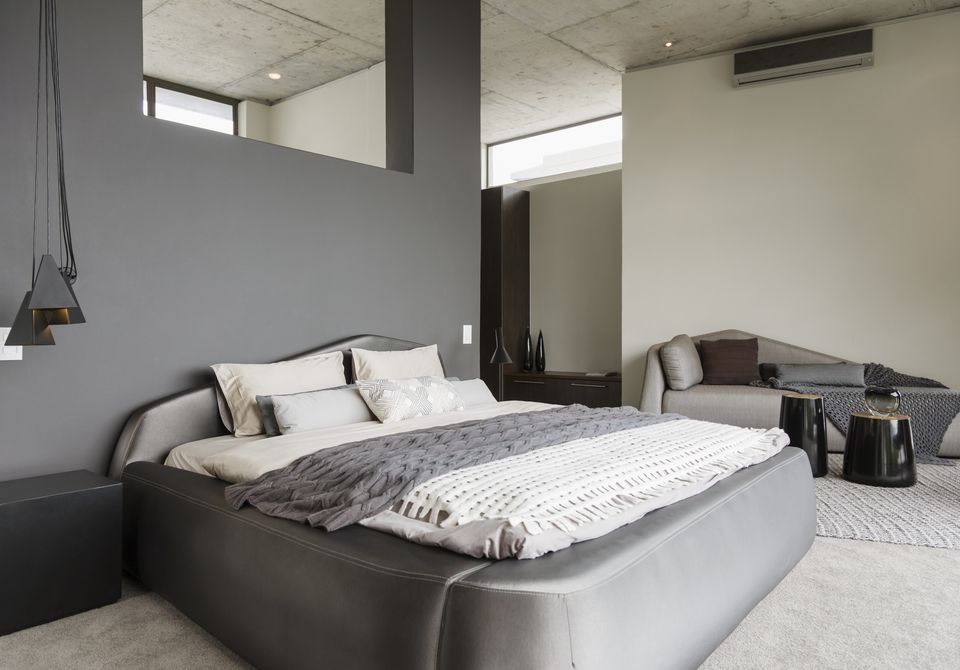 Серая спальня — отличная идея при обустройстве новой квартиры, потому что легко найти аксессуары, которые сделают комнату оригинальной. Бетонные плиты ассоциируются, прежде всего, с промышленными интерьерами, все чаще появляются в более классических аранжировках. В сочетании с серыми стеганными изголовьями и постельными принадлежностями в монохромной версии создадут гармоничную и спокойную композицию. В спальне следует избегать резких контрастов, так как это место, где вы отдыхаете, поэтому обстановка должна быть расслабляющей, а не стимулирующей к действию. Если вам не нравится бежевый цвет, а белая мебель кажется слишком громоздкой для уборки, то серая спальня — идеальное решение.