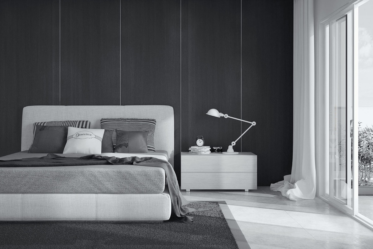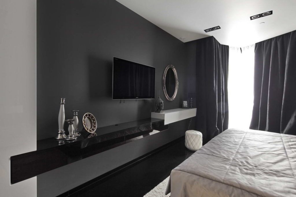 Темно-серая спальня полностью отвечает концепции данного стилевого направления, которое характеризуется монохромностью, простотой, элегантностью, геометрическими орнаментами, выдержанностью.
