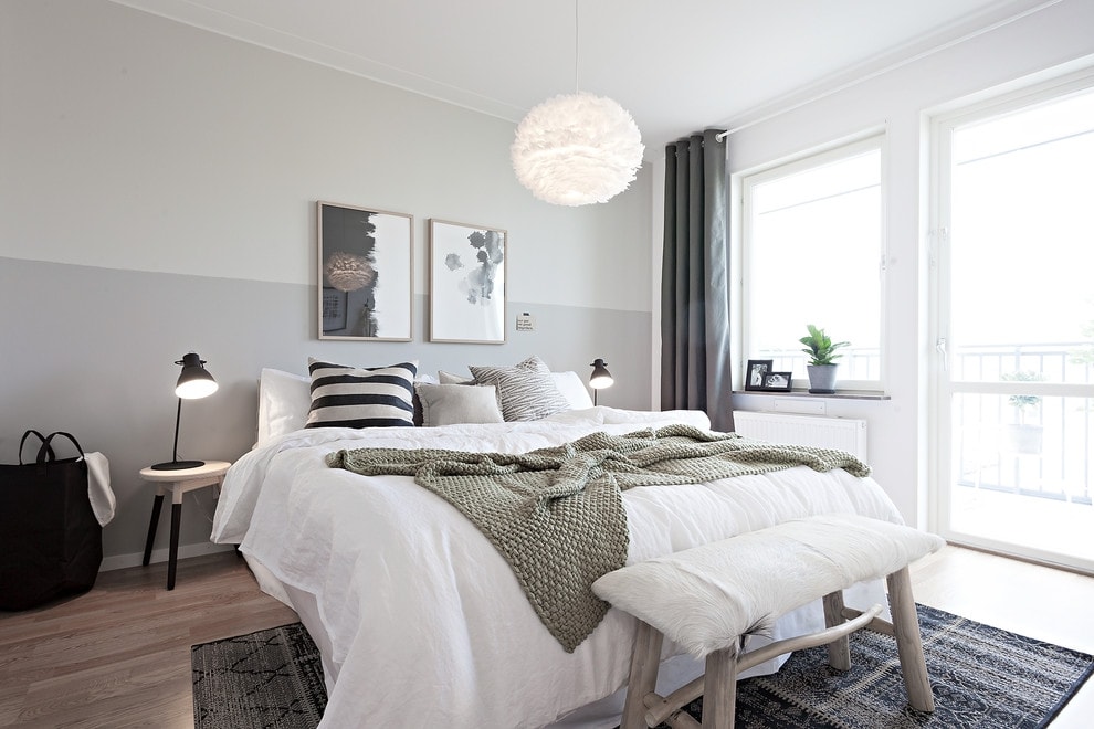 Сочетание серого с белым — классическое и элегантное решение. Белый цвет придает легкость и воздушность, а серый создает основу и придает помещению глубину. Такое сочетание идеально подойдет для спальни в скандинавском стиле или для создания минималистического интерьера.