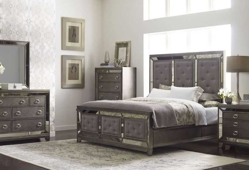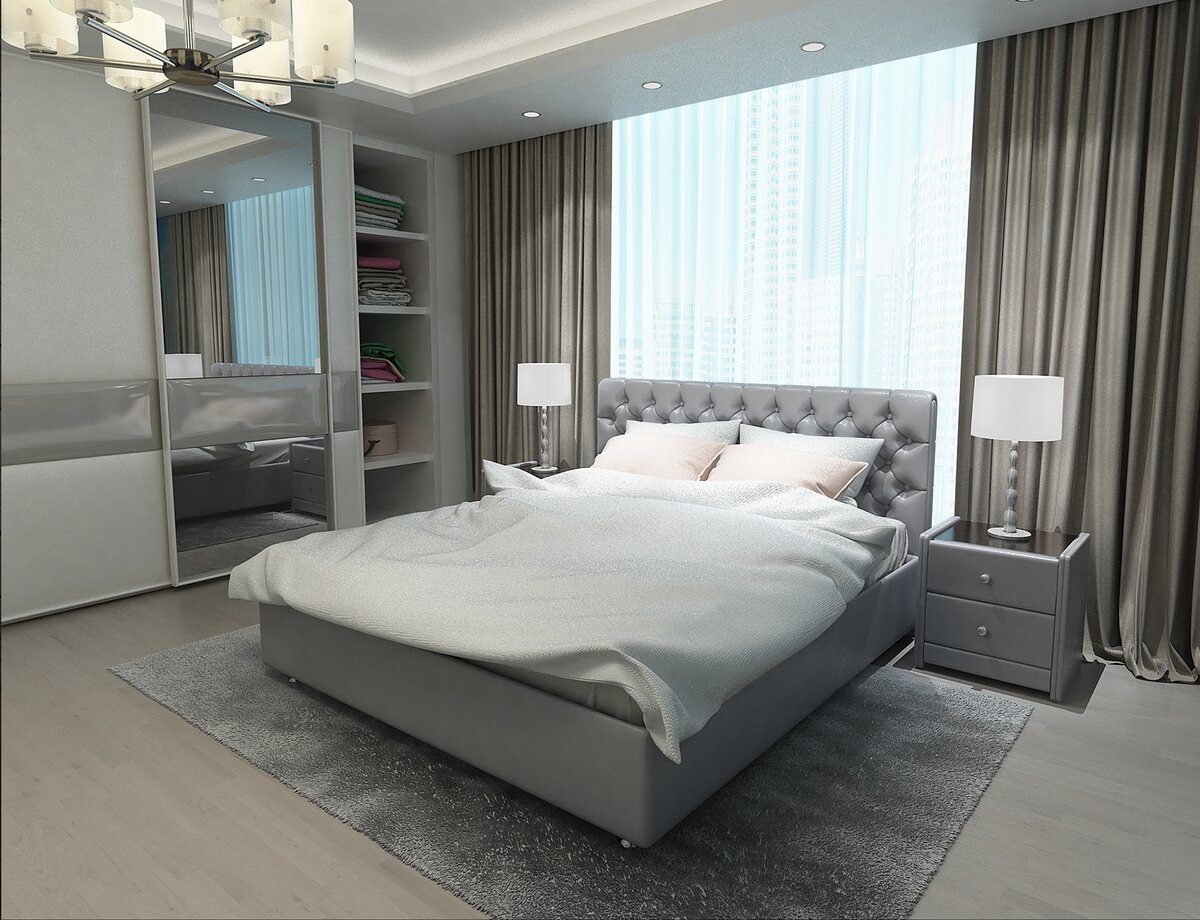 Подходящим вариантом для серой спальни станет выбор глянцевой поверхности, на которой будет заметен отражающий эффект.