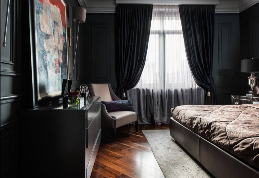 - Глубокие темные. Кобальтовый, коричневый, бордовый, баклажановый тоже будут стильно будут смотреться в комбинации. Они придадут комнате спокойной и расслабленной атмосферы.