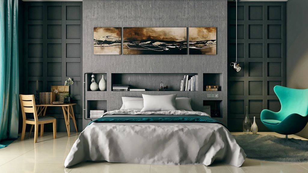 Серые стены в спальне можно украсить чем угодно. Это могут быть картины с изображением пейзажа, графики или абстракции.