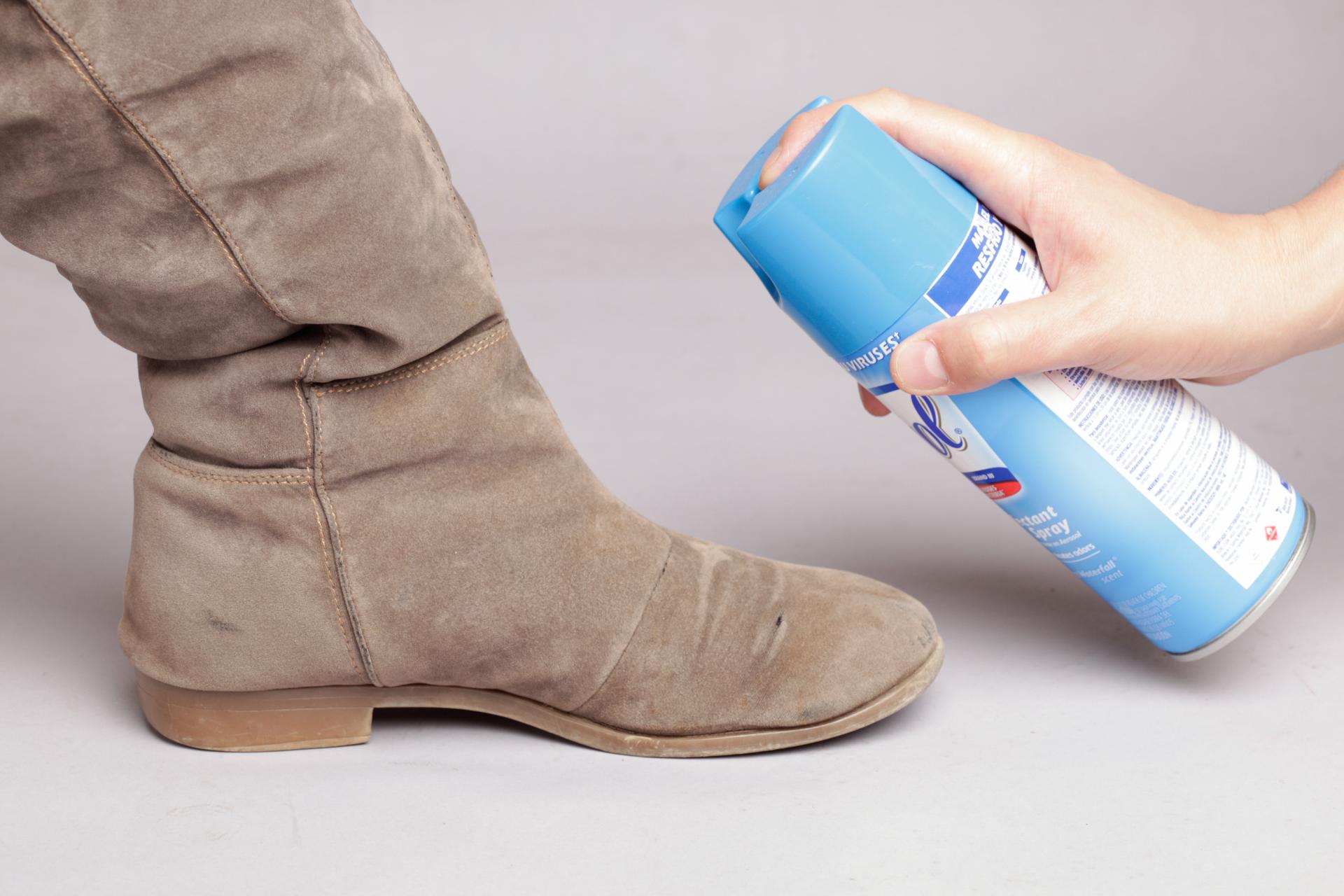 - Водоотталкивающим спреем обувь обрабатывают вечером, чтобы поверхность полностью впитала состав.